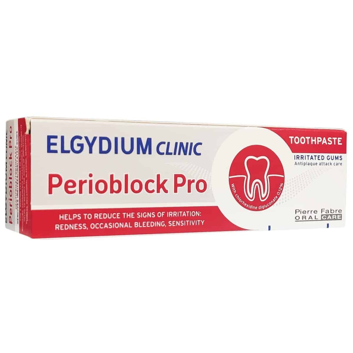 Η ELGYDIUM Clinic Perioblock Pro αξιοποιεί την καταπραϋντική δράση του γλυκυρρητινικού οξέος και της αλλαντοΐνης με σκοπό να ανακουφίσει τα ερεθισμένα ούλα. Η σύνθεσή της με χλωρεξιδίνη καταπολεμά τη συσσώρευση πλάκας και προσφέρει ισχυρή αντιβακτηριακή δράση. Η διπλή της δράση, στο πλαίσιο καθημερινής χρήσης για 1 μήνα θεραπείας, αντιμετωπίζει τόσο τα παθογόνα βακτήρια όσο και τον ερεθισμό των ούλων. Πρόκειται για μια εύκολη στη χρήση ζελ-πάστα που παρατείνει την αποτελεσματικότητα της αποτρύγωσης (καθαρισμός) μετά από ένα μήνα χρήσης.