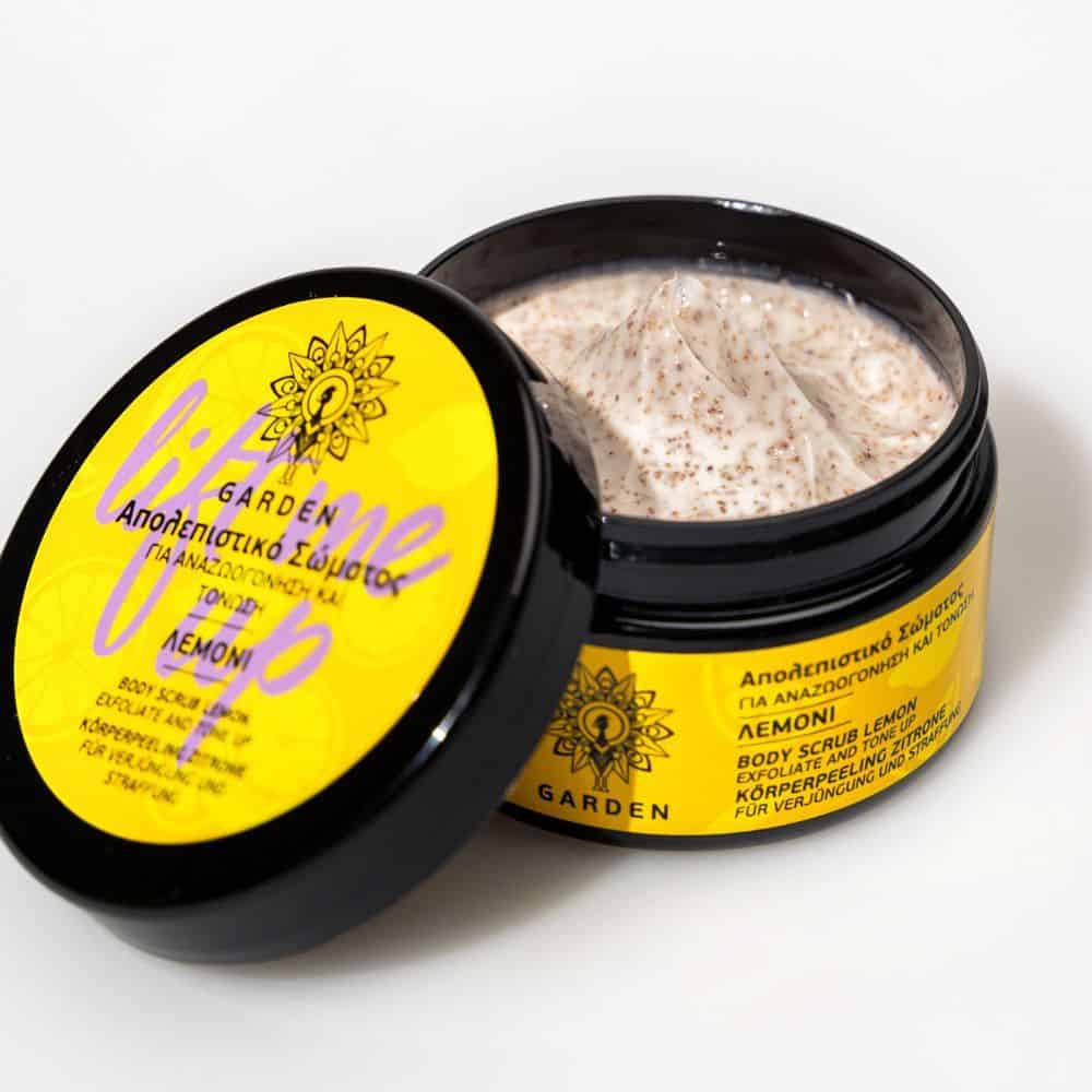 Απολεπιστικό σώματος λεμόνι µε κόκκους αµυγδάλου, εµπλουτισµένο µε αλόη, βούτυρο καριτέ, έλαιο ελιάς και πορτοκαλιού.
