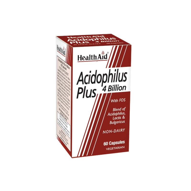 Το HEALTH AID Acidophilus Plus αποτελεί συνδυασμό 3 προβιοτικών στελεχών (Lactobacillus Acidophilus, Lactobacillus Bulgaricus, Bifidobacterium Lactis), σε ποσότητα 4 δισεκατομμυρίων/κάψουλα, μαζί με πρεβιοτικά (FOS) για μέγιστο αποτέλεσμα.