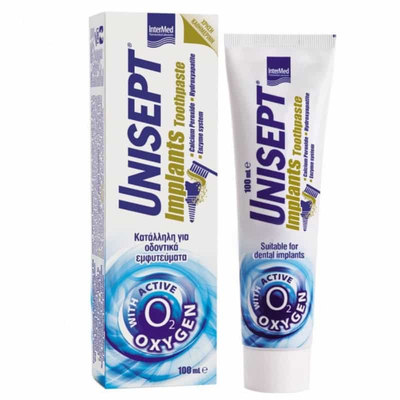 Η Unisept Implants Toothpaste είναι μια πρωτοποριακή οδοντόπαστα ειδικά σχεδιασμένη για καθημερινή χρήση. Προορίζεται για χρήση από άτομα με οδοντικά εμφυτεύματα και βοηθά στην καθαριότητα της περιοχής γύρω από τα εμφυτεύματα ενώ, ταυτόχρονα, τα προστατεύει χάρη στο υπεροξείδιο του ασβεστίου και το ενζυμικό σύστημα. Βοηθά στην ενδυνάμωση της αδαμαντίνης χάρη στους κρυστάλλους υδροξυαπατίτη, ενώ η χαμηλή περιεκτικότητα φθορίου συνεισφέρει στην προστασία των εμφυτευμάτων από την οξείδωση.