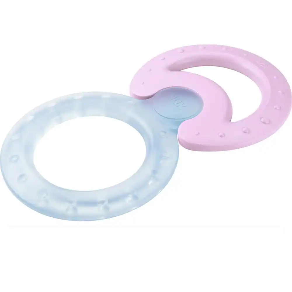 Το σετ δακτυλίων οδοντοφυΐας Cool της NUK βοηθά το μωρό σας με δύο τρόπους: ο δακτύλιος Classic κάνει μασάζ στον ουρανίσκο και στα ούλα, ενώ ο δακτύλιος Cool δροσίζει και ανακουφίζει τα σημεία όπου εντοπίζεται ο πόνος, χωρίς να περιέχει υγρό. Χάρη στο εργονομικό τους σχήμα, οι δακτύλιοι φτάνουν εύκολα σε κάθε σημείο των σιαγόνων. Οι μασητικές κινήσεις διεγείρουν τη ροή του σάλιου, το οποίο με τη σειρά του βοηθά στην πρόληψη της τερηδόνας. Η ανάγλυφη επιφάνεια οξύνει την αίσθηση της αφής, ενώ η δυνατότητα συναρμολόγησης παρακινεί το μωρό να παίξει.