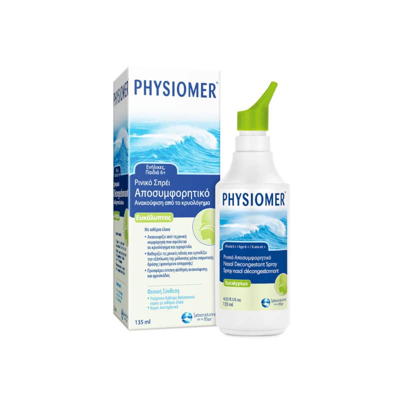 Το PHYSIOMER Ευκάλυπτος είναι ένα φυσικό ρινικό αποσυμφορητικό που συνδυάζει τις αποσυμφορητικές ιδιότητες του θαλασσινού νερού με τις αναζωογονητικές ιδιότητες των αιθέριων ελαίων Ευκαλύπτου & Άγριας Μέντας προσφέροντας ανακούφιση από τη ρινική συμφόρηση σε 3 μόλις λεπτά και ευχάριστη αίσθηση φρεσκάδας!