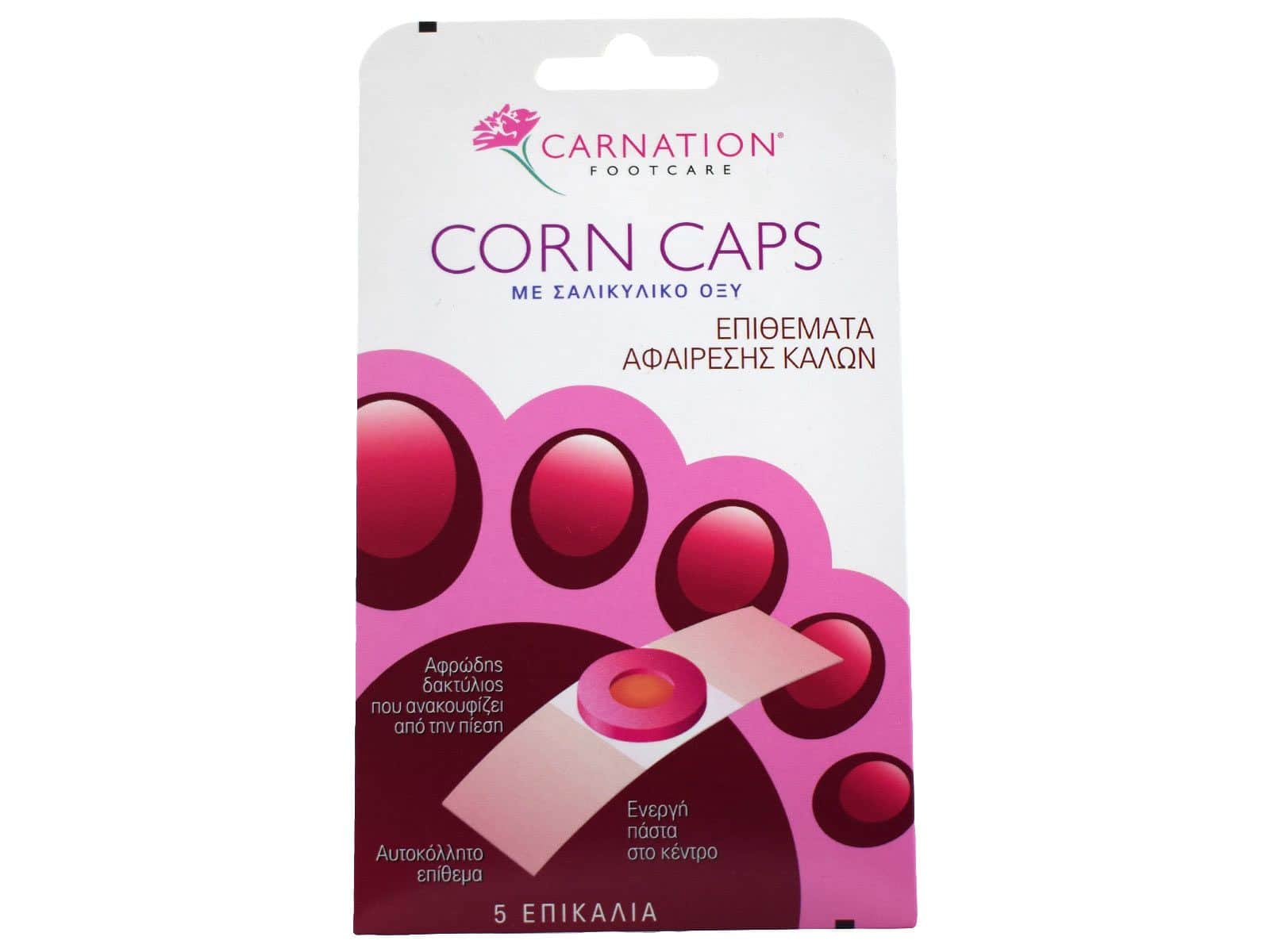 Το Carnation corn caps περιέχει μια μοναδική κρέμα σαλυκιλικού οξέος η οποία εισχωρεί στους σκληρούς κάλους και βοηθά στην αφαίρεσή τους,ενώ ταυτόχρονα το αφρώδες δαχτυλίδι ανακουφίζει από την πίεση του υποδήματος.